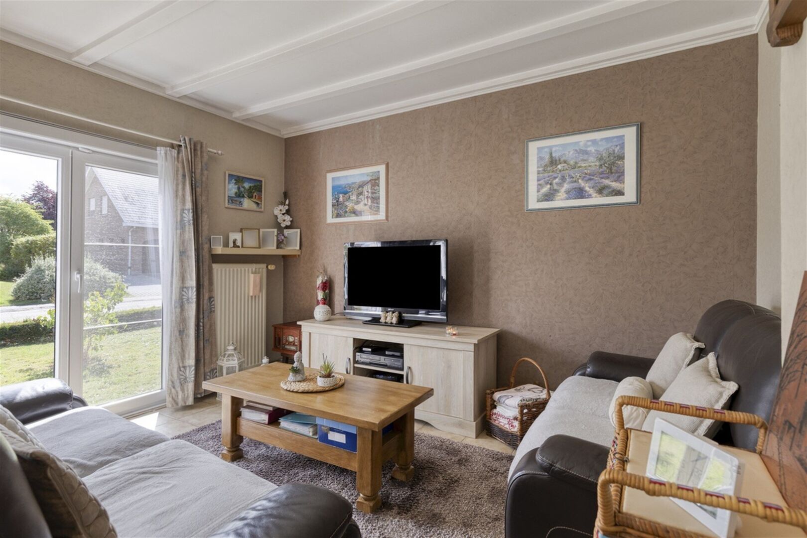 On entering the house, you enter a spacious and bright living room, ideal to set up as a cozy living space with dining and sitting area. Large windows provide plenty of natural light.