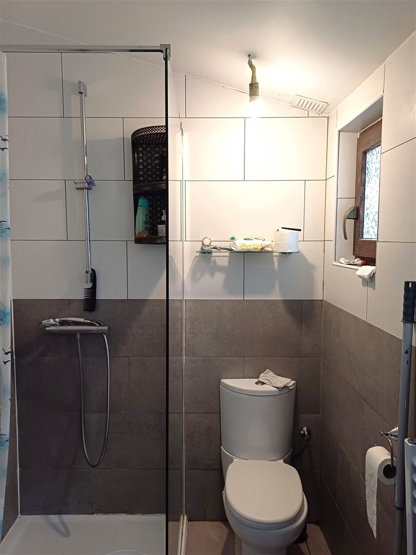The property is +/- 86 m² and is divided as follows: livingroom with front door and kitchen with access to the garden and to the bathroom ( wc, shower and sink)