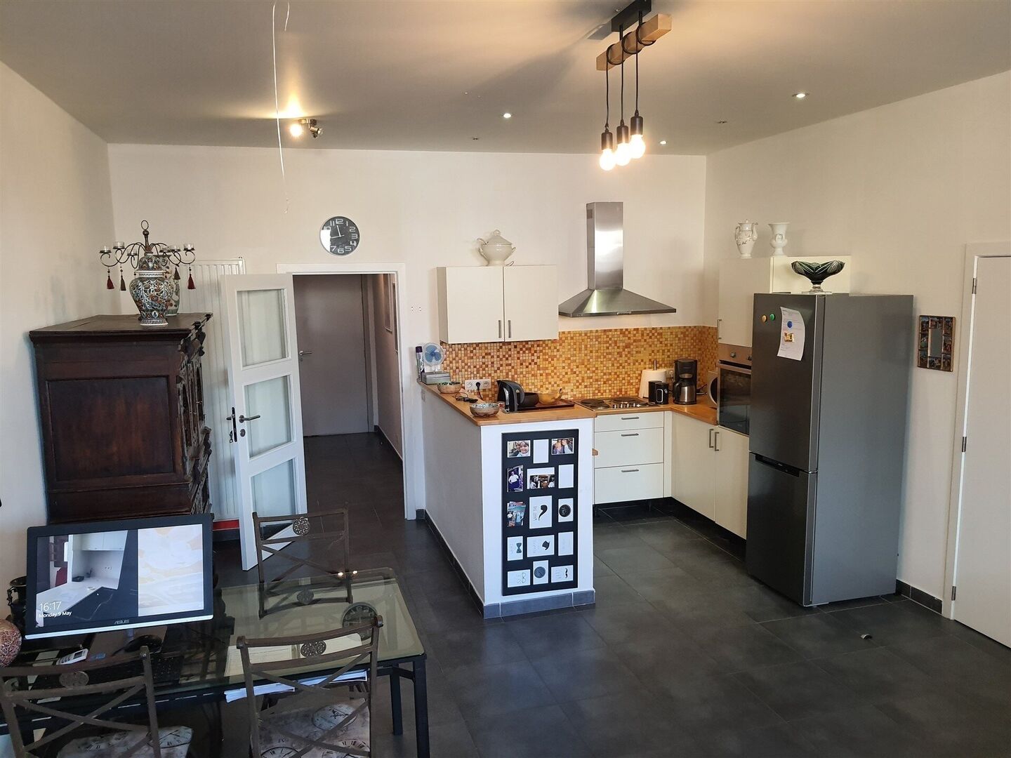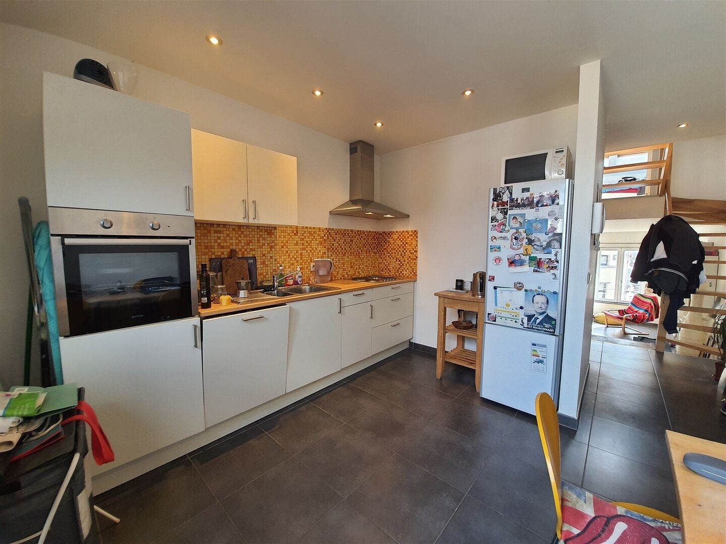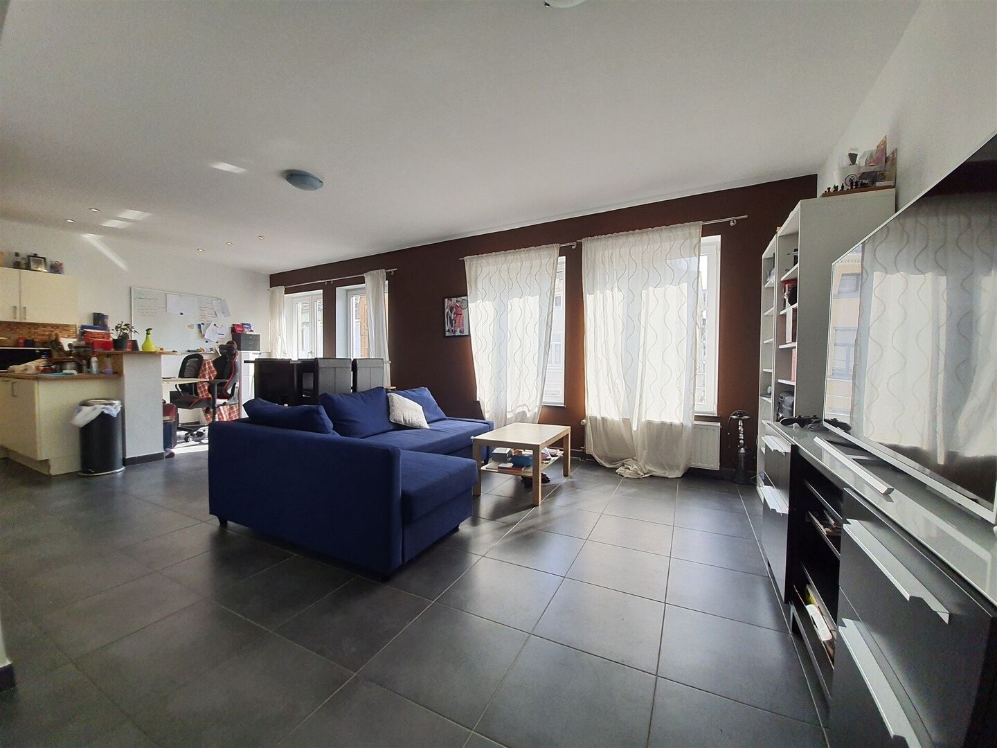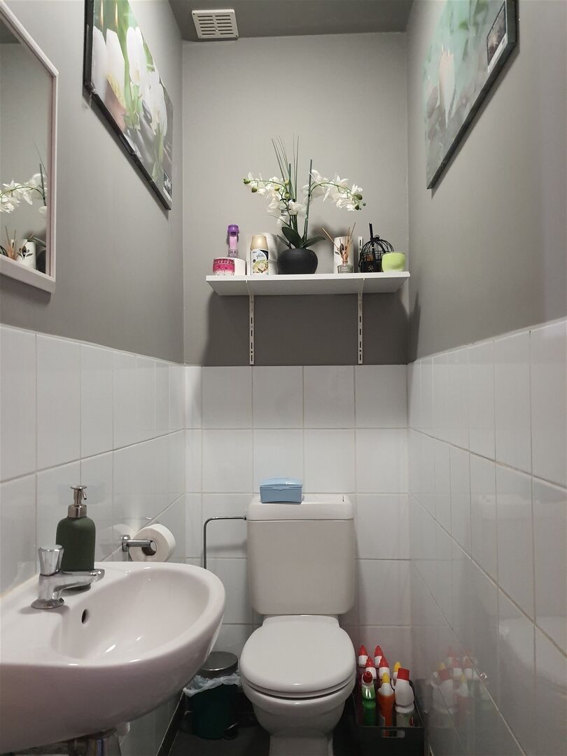 1st floor: 2 flats: one at the rear of +/- 85 m² with 1 bedroom and an office (available), the other at the front of +/- 70 m² with a bedroom (rented).