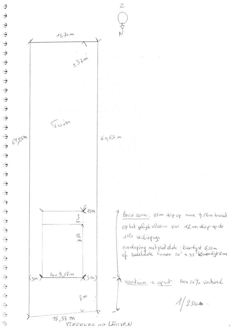 La profondeur maximale du bâtiment est de 15 m au rez-de-chaussée et de 12 m au premier étage ou de 13 m et 13 m, avec une bande non constructible de 3 m le long du côté exposé aux intempéries (sur le côté droit, la distance entre la route et les parcelles arrière est de 3 m). Le volume constructible total dépend du projet (à confirmer avec la municipalité). La hauteur autorisée sous la corniche est de 6 m (toit à deux versants entre 20° et 45°) ou de 7 m (toit plat). Un maximum de 50 % du jardin avant peut être pavé. Maximum 40% de pavage par rapport à 60% de verdure sur le terrain. Les directives générales suivantes s'appliquent :