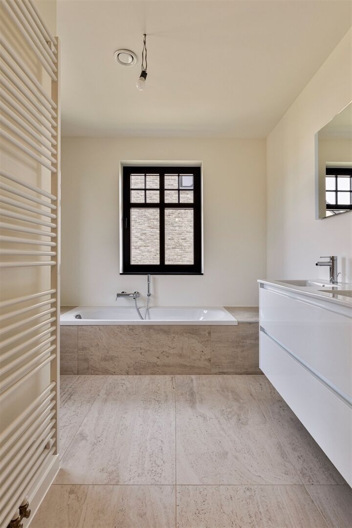 Au 1er étage, palier, 3 chambres et une salle de bains avec double lavabo, baignoire et douche. Toilettes séparées et espace pour unité de ventilation.