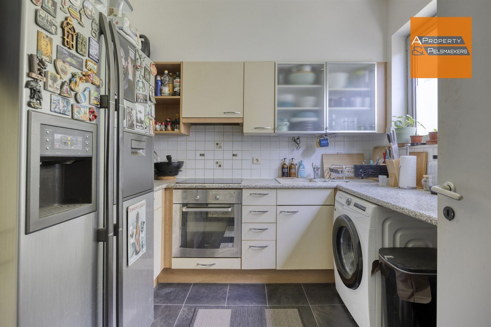 Op het gelijkvloers bevinden zich een gezellige leefruimte, eetplaats, een praktische keuken en een apart toilet. Via de leefruimte heb je toegang tot de privatieve tuin, ideaal om in alle rust te ontspannen.