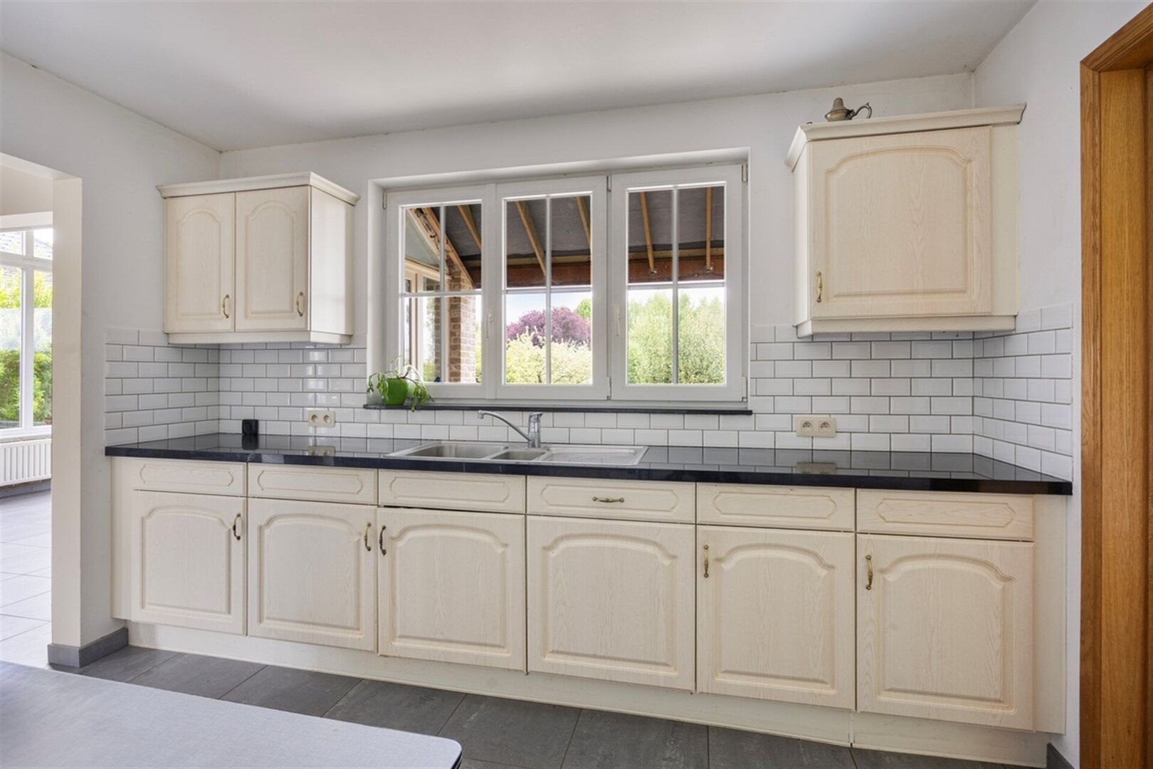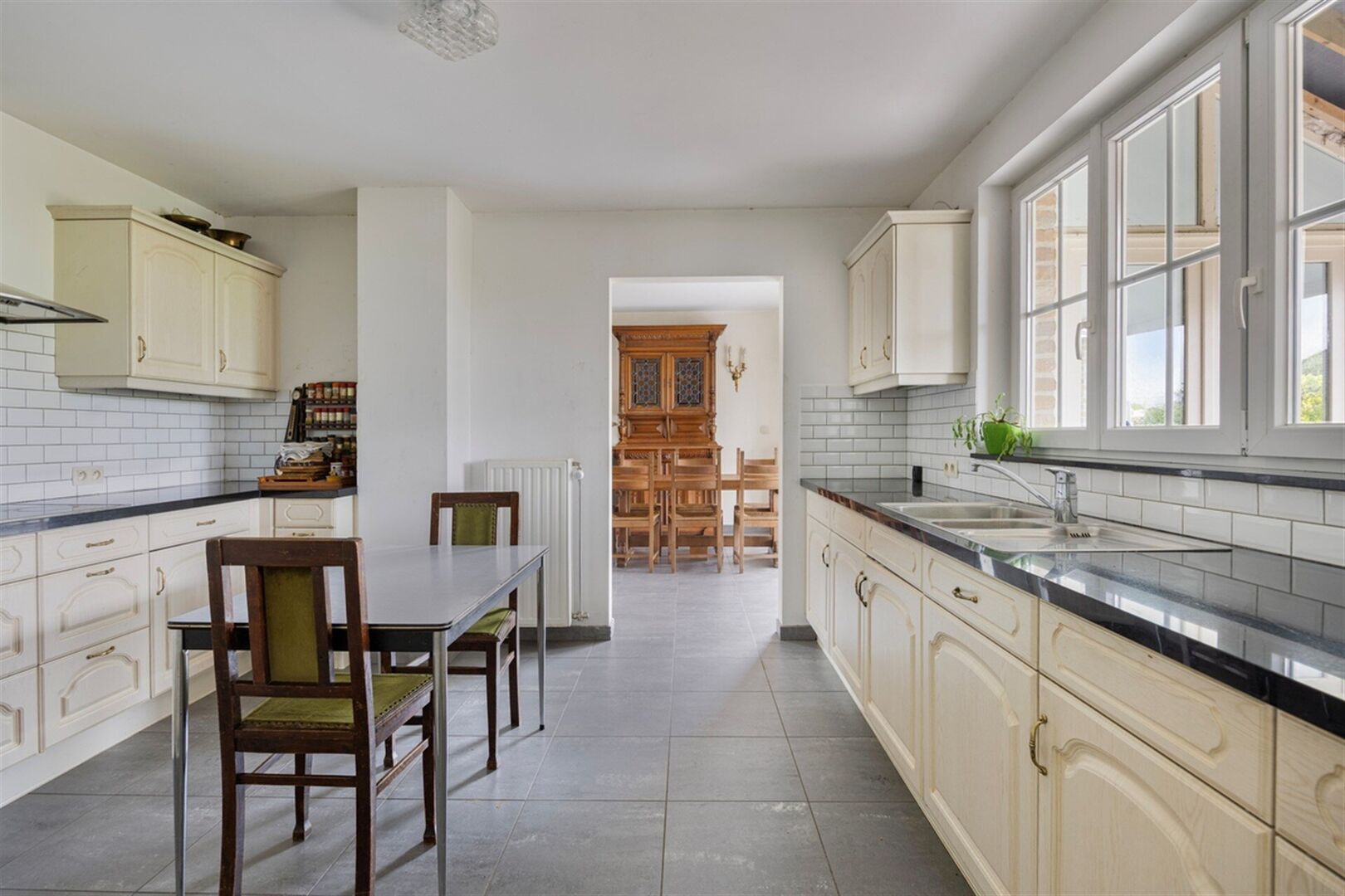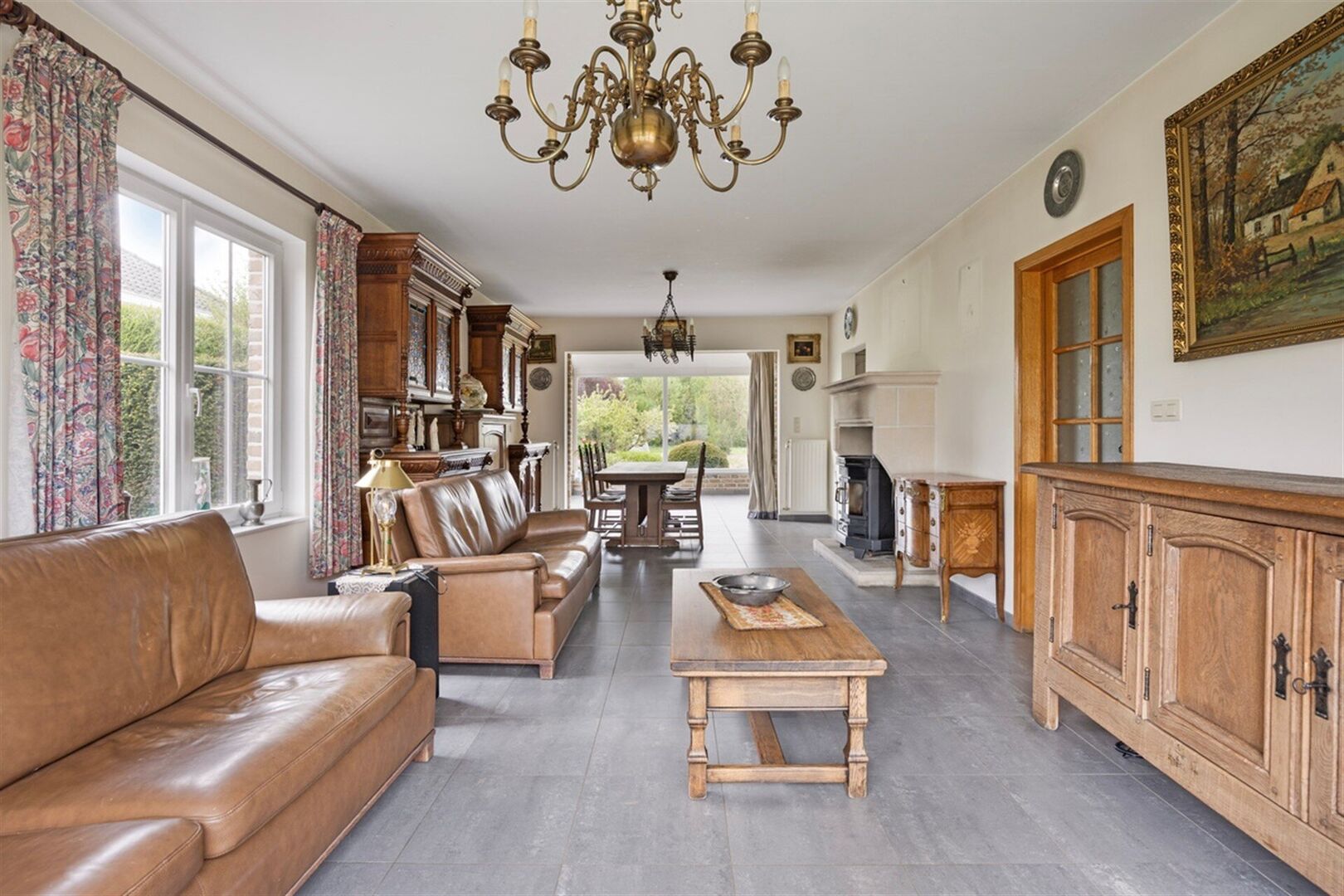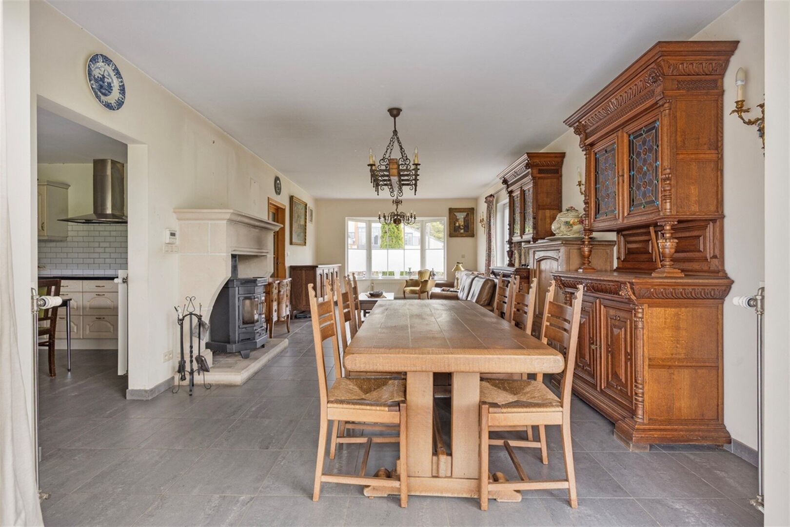 De lichtrijke leefruimte straalt gezelligheid uit dankzij de grote raampartijen en de aanwezigheid van een sfeervolle houtkachel. Aansluitend vindt u de ruime, volledig uitgeruste keuken met elektrische kookplaat, oven, koelkast, vaatwasser en een dubbele spoelbak.