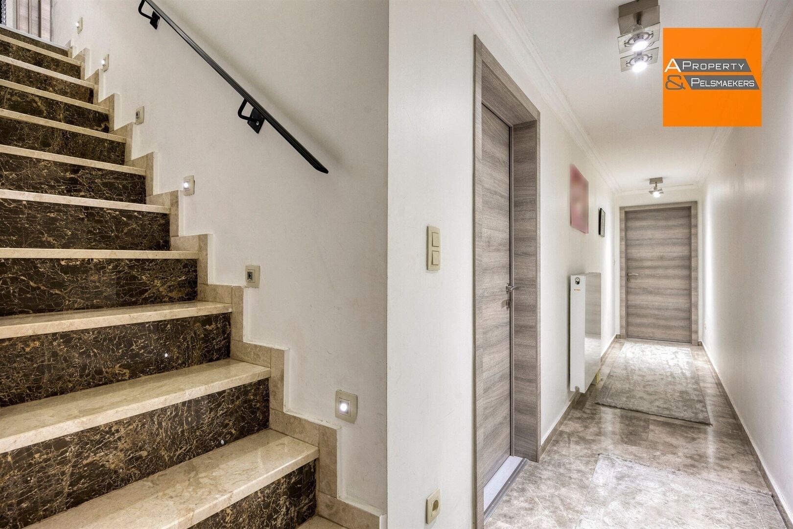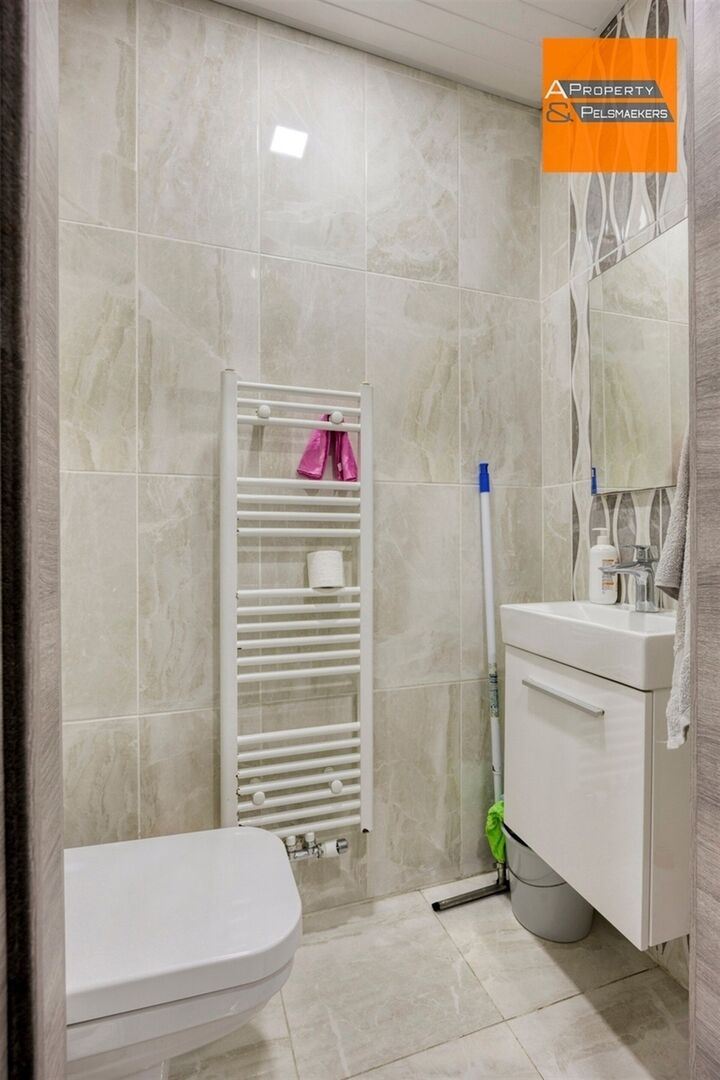 Op het gelijkvloers bevindt zich een ruime en lichtrijke leefruimte met een open keuken, die naadloos aansluit op de veranda met toegang tot de tuin. Verder zijn er een apart toilet en een vestiaire aanwezig.