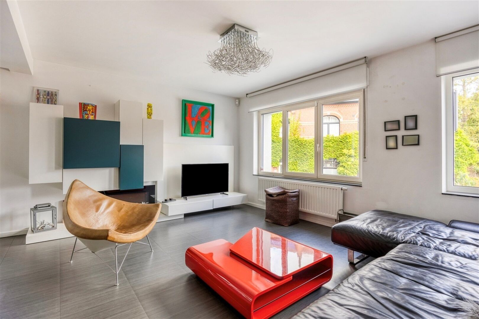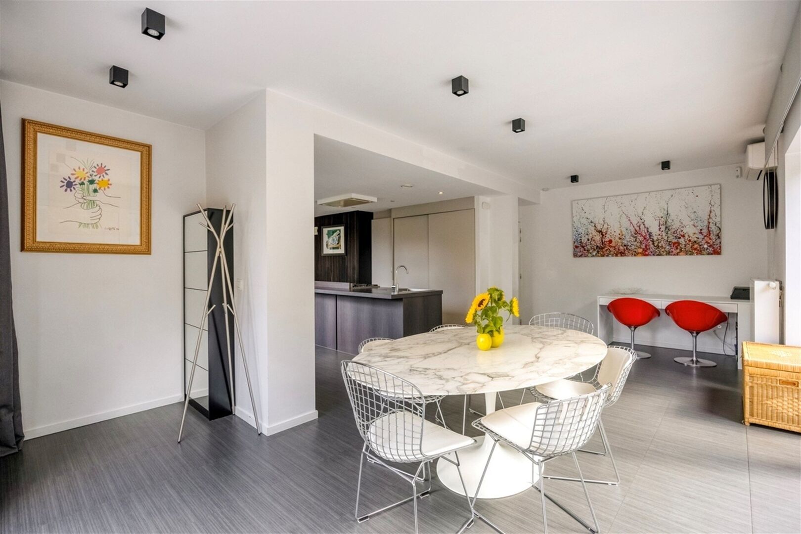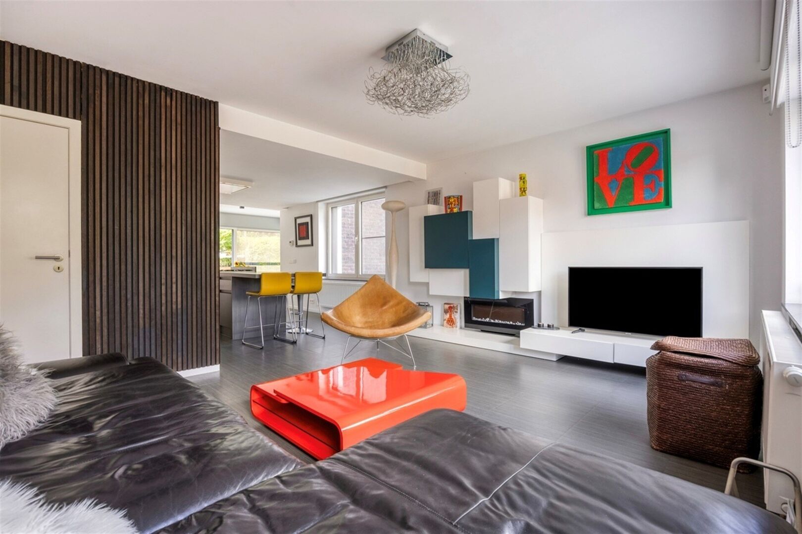 De gelijkvloerse verdieping biedt een open en luchtige leefruimte met een moderne look, een gezellige zithoek en een speelse inrichting met designaccenten. Grote ramen zorgen voor veel lichtinval en een mooi zicht op de tuin. De living vloeit naadloos over in de ruime eetplaats en de volledig uitgeruste keuken, ideaal voor gezellige momenten met familie en vrienden.