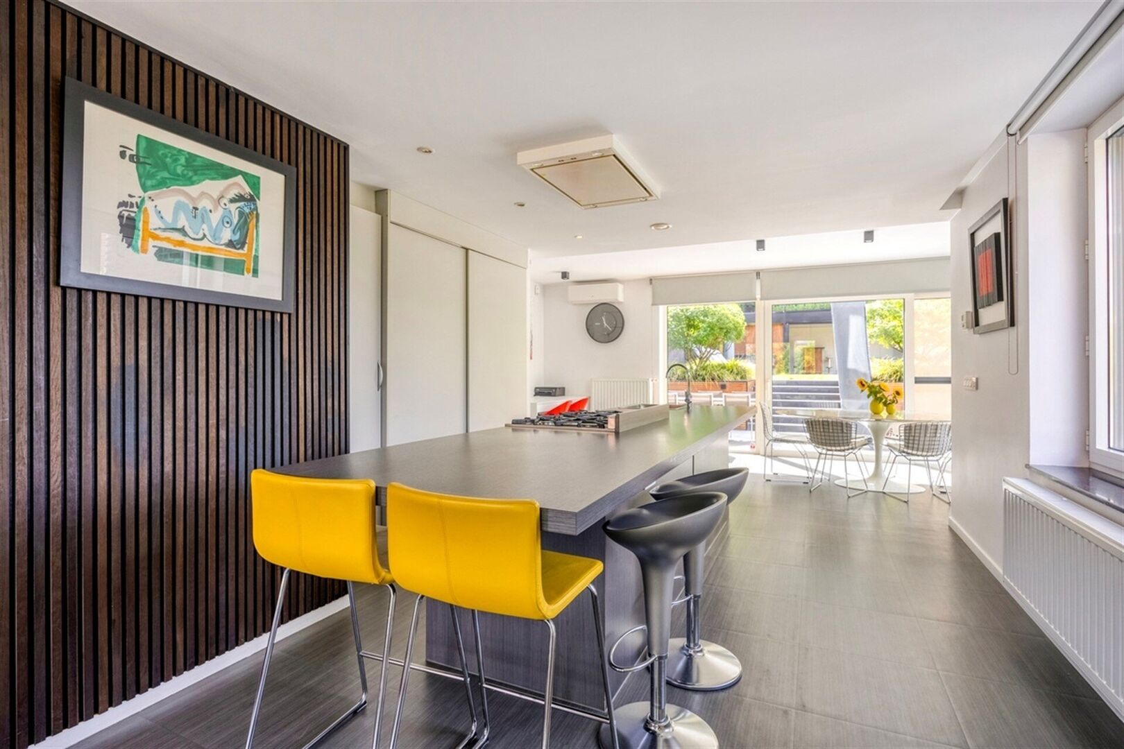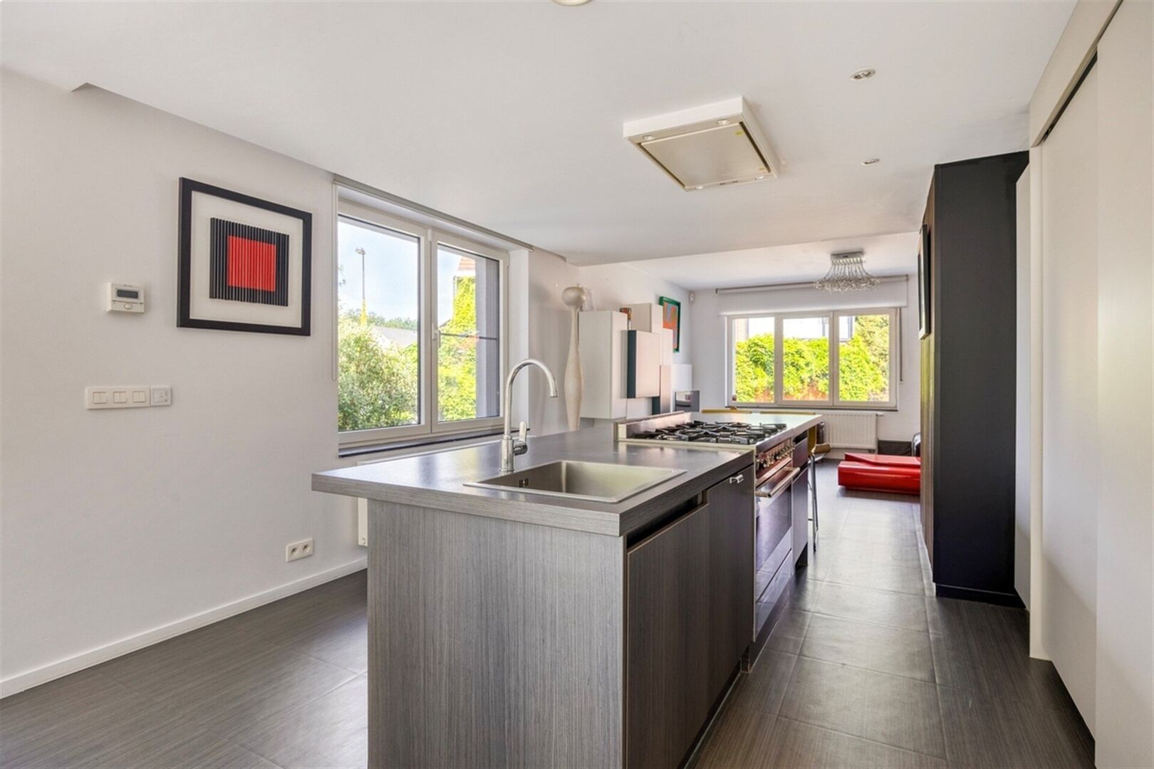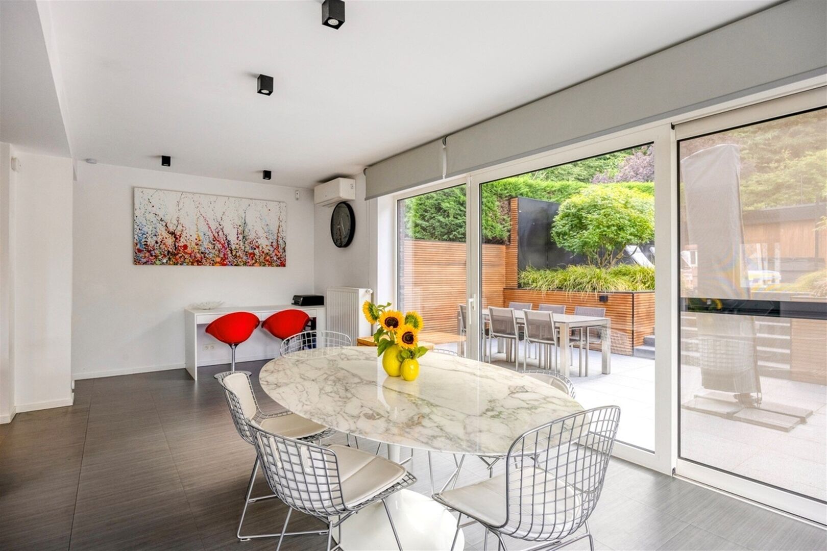 De gelijkvloerse verdieping biedt een open en luchtige leefruimte met een moderne look, een gezellige zithoek en een speelse inrichting met designaccenten. Grote ramen zorgen voor veel lichtinval en een mooi zicht op de tuin. De living vloeit naadloos over in de ruime eetplaats en de volledig uitgeruste keuken, ideaal voor gezellige momenten met familie en vrienden.