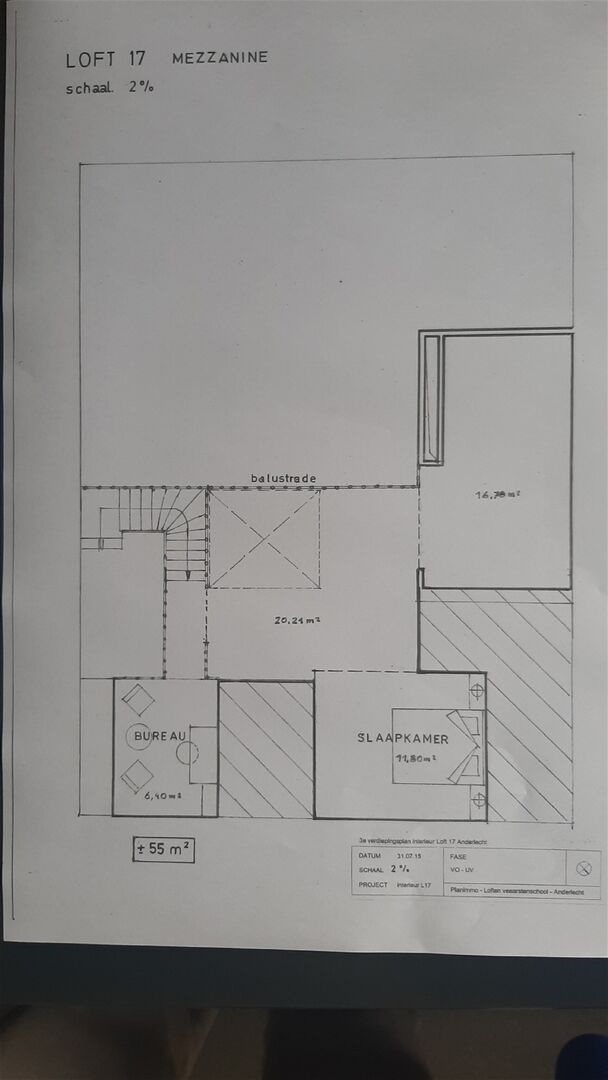 Indeling: open inkomhal, apart toilet, berging/wasplaats, open ingerichte keuken uitgevend op de woonkamer van +/- 75 m², ruime badkamer met ligbad, douche en dubbele lavabo en toilet, een TV zithoek of ruimte voor een slaapkamer van +/- 17 m², een slaapkamer van +/- 16 m² of kantoorruimte, prachtige mezzanine van 55 m² verdeeld in een bureauruimte van +/- 6 m², een centrale ruimte van +/- 20m², een ruimte voor een slaapkamer van +/- 12m², en een berging van +/- 16 m². ( zie foto's van de plannen )