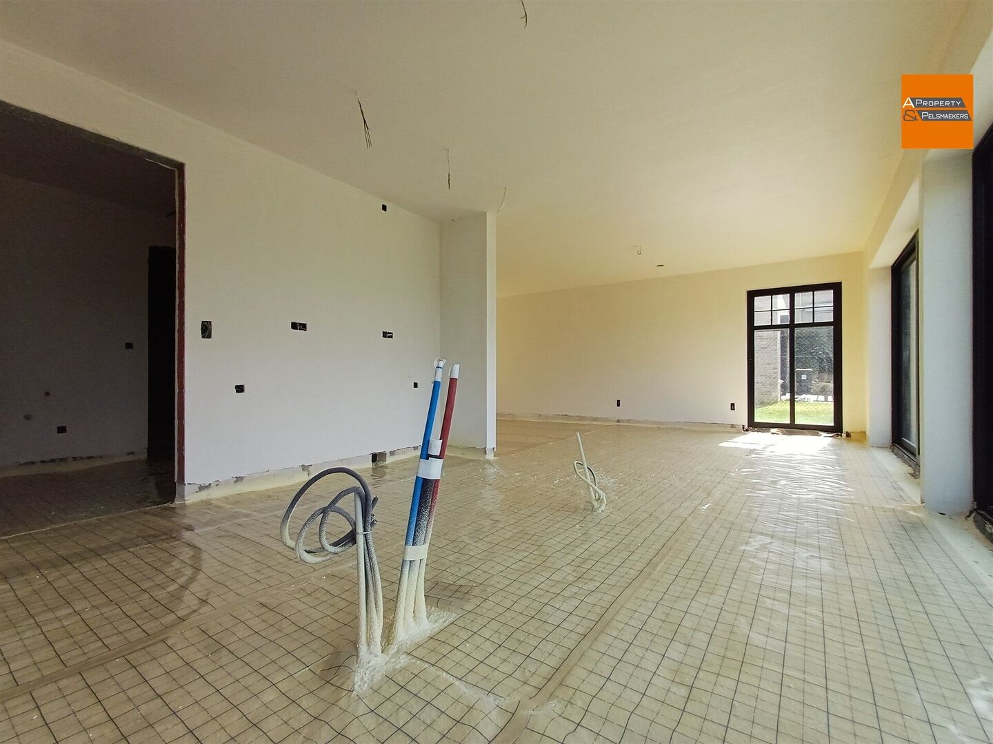 Indeling: Ruime inkomhal met toilet, ruimte voor vestiaire, grote garage met elektrische poort, L vormige en zonnige leefruimte met toegang tot een groot terras en de tuin via een dubbele schuiframen, bureau/ speelhoek, Amerikaanse keuken hyper geïnstalleerd (naar keuze van de klant) met aanpalende berging.