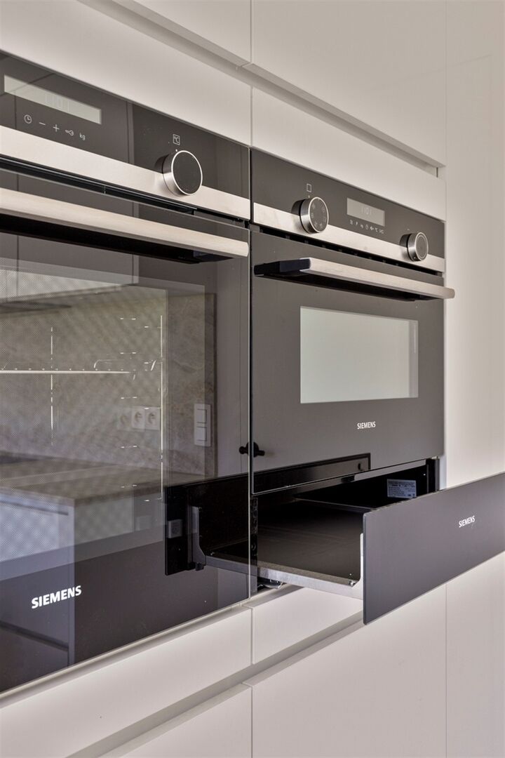 Indeling: Ruime inkomhal met toilet, ruimte voor vestiaire, grote garage met elektrische poort, L vormige en zonnige leefruimte met toegang tot een groot terras en de tuin via een dubbele schuiframen, bureau/ speelhoek, Amerikaanse keuken hyper geïnstalleerd (naar keuze van de klant) met aanpalende berging.