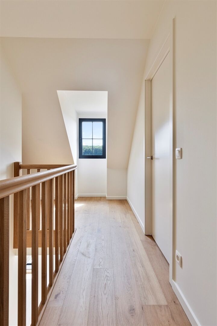 Op de 1° verdieping, overloop, 3 slaapkamers en een badkamer met dubbel lavabo, bad en douche. Apart toilet en ruimte voor ventilatie unit.